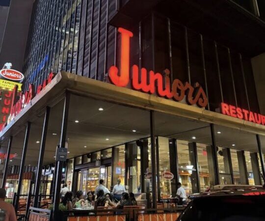 It was Emma’s first time in New York City. The streets buzzed with the kind of energy she’d only ever seen in movies—yellow cabs darting between lanes, the chatter of strangers blending into the hum of the city, and skyscrapers that seemed to touch the clouds. After a long day of exploring Central Park and wandering through the lights of Times Square, she found herself drawn to a glowing red neon sign that read Junior’s Restaurant.